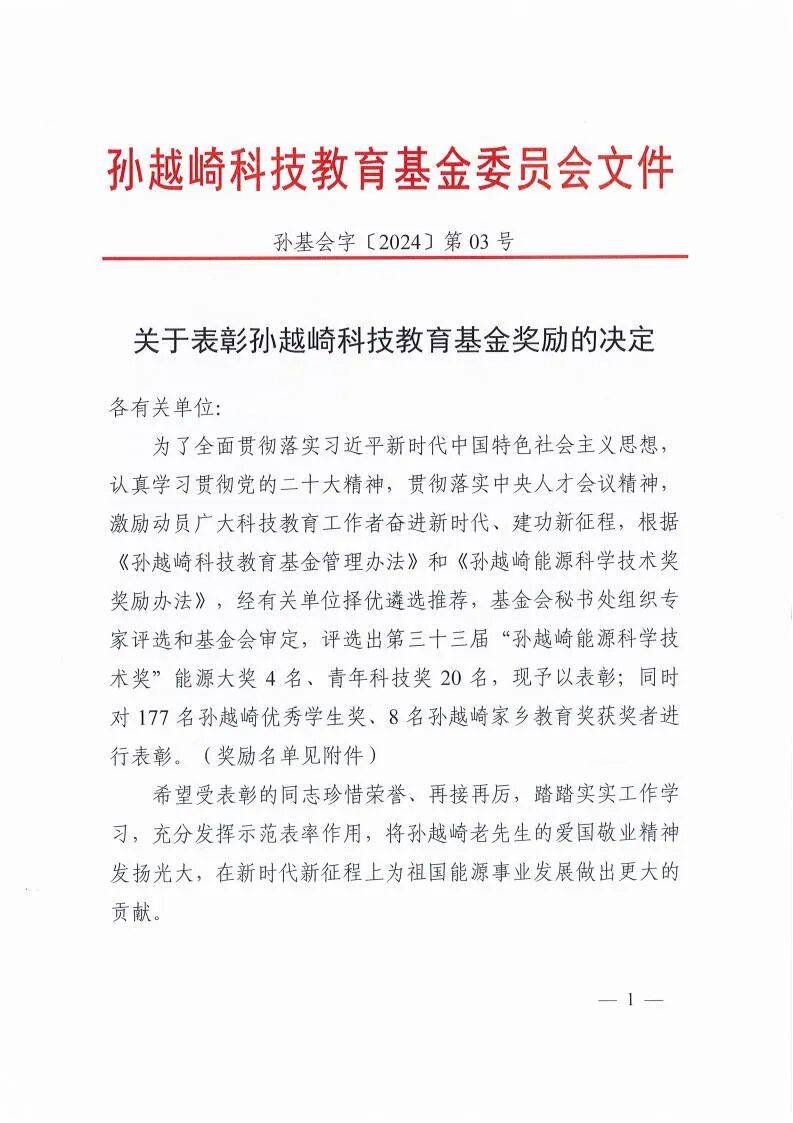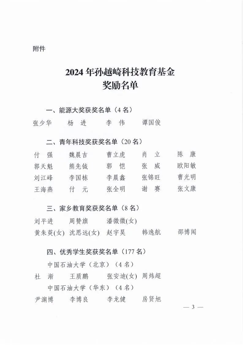 2024年10月16日上午,第三十三届孙越崎能源科学技术奖颁奖大会在中国煤科天地大厦学术报告厅举行,共有209名在能源科技和教育战线做出突出贡献的优秀科技工作者和优秀学生分获4项奖励。其中中国石油集团东方地球物理勘探有限公司张少华、中国石油大学(北京)杨进、山东能源集团李伟、中国矿业大学谭国俊4人获得第三十三届孙越崎能源大奖,20人获得青年科技奖,177人获得优秀学生奖,8人获得家乡教育奖。会议由孙越崎科技教育基金会原副理事长,原国务院参事,中国石油天然气集团公司原副总经理、党组成员郑虎主持。